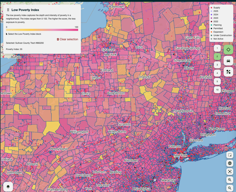 The Radius+ team is excited to announce our newest feature layer release- the low poverty index. This layer captures the depth and intensity of poverty in a neighborhood. It ranges from 0 to 100. The higher the score, the less exposure to poverty. The index is designed to help determine access to economic opportunities.